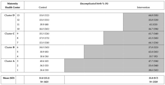 The percentage of uncomplicated births was 51.8% (95% confidence interval (CI) 50.1–53.9%) for the control group and 55.0% (CI 53.5–56.5%) for the intervention group (p = 0.289).