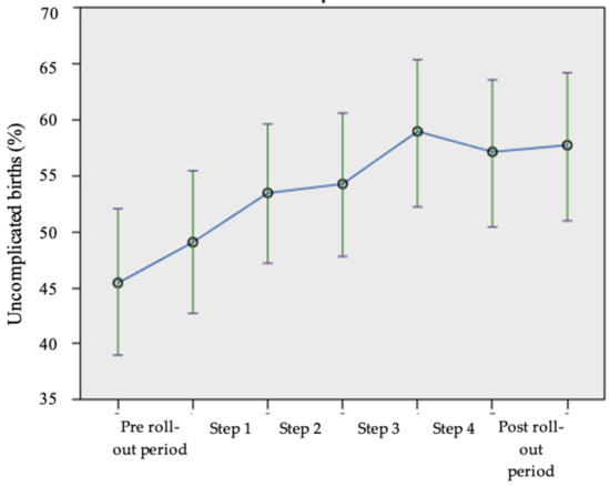 Figure 4 presents the total percentage of uncomplicated births for both groups in each step of the study. This percentage increased from 45.4% (CI 42.1–47.9%), during the pre-rollout period, to 59.0% (CI 52.0–65.3%) for the women that were included in step 4, and slightly decreased afterwards. Estimated means revealed that the differences in uncomplicated births in the stepped-wedge design were due to time instead of the intervention (p = 0.289).