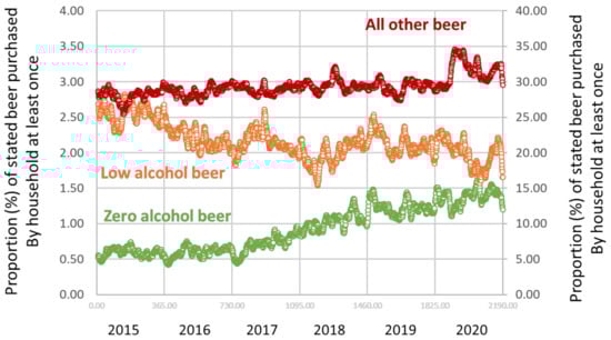 Previously, we have shown that the introduction of new lower strength beers resulted in British households purchasing fewer grams of ethanol overall []. From 2015 to 2018, the introduction of 46 new zero or low alcohol (defined as 3.5% Alcohol by Volume (ABV) or less) beers was associated with reductions in purchases of grams of ethanol across all beer products and across all alcohol products []. Despite several evidence reviews concerning zero and low alcohol beer specifically [,], there remains a dearth of studies investigating which factors influence the actual purchasing and consumption of these products. Qualitative evidence suggests that choosing specific lower strength products tends to be driven by previous consumption of higher strength products from the same brand []. Other studies indicate that health and wellbeing issues, price differentials, and overall decreases in the social stigma associated with drinking alcohol-free beverages may also drive decisions to buy and consume zero and low alcohol beers [].
