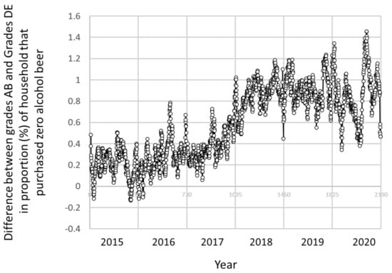 For purchase of zero alcohol beer, we also examined differences based on the social grade over time (Figure 2). The differences by social grade widened over time, and the absolute difference between social grade groups AB and DE increased by 0.0396% (95% CI = 0.0384 to 0.0408) per every three months over the six years 2015 to 2020.