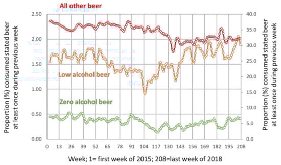 Proportion (%) of survey respondents who reported consuming at least one drink of zero alcohol beer (green, left vertical axis), low alcohol beer (orange, left vertical axis) and all other beer (red, right vertical axis) by week, 2015 to 2018.
