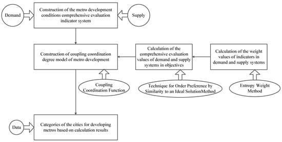 In order to measure the coupling coordination degree of metro systems, three procedures are proposed in Figure 1. Firstly, a comprehensive evaluation indicator system of metro development conditions is carried out from demand and supply perspective. Secondly, a coupling coordination degree model is developed based on the coupling coordination function to assess the coupling coordination conditions of metro systems. Furthermore, two other methods are also used in the model. The Technique for Order Preference by Similarity to an Ideal Solution (TOPSIS) method is used to calculate the comprehensive evaluation values of demand and supply systems in metro systems. The entropy weight method is used to calculate the weight values of indicators in demand and supply systems. Finally, through data collection, an empirical analysis can be raised, and the categories of the cities for developing metros based on calculation results can be identified.