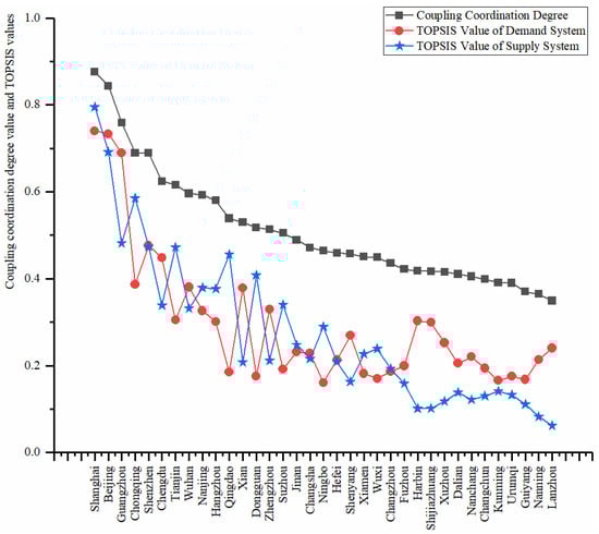 Coupling coordination degree values and TOPSIS values of all cities.