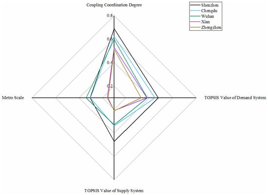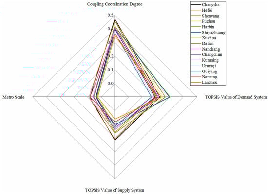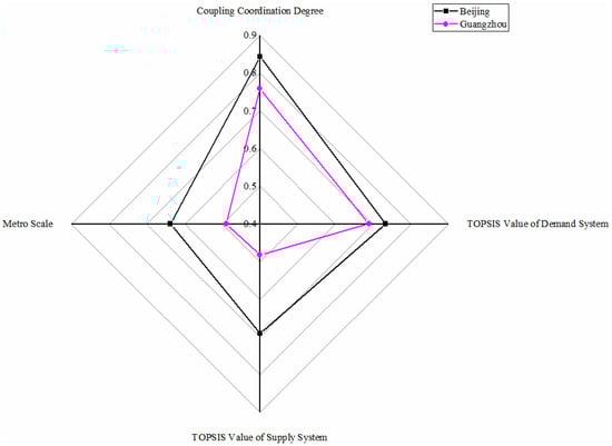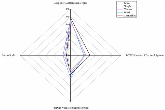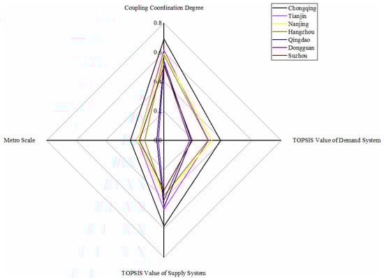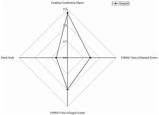As shown in Figure 3, only the Shanghai metro system belongs to this category, whose TOPSIS values of demand and supply system and coupling coordination degree value rank first, symbolizing the most excellent development condition of the metro system. Significant population mobility, difficult environmental situation, and traffic congestion motivate the demand for metro development; meanwhile, a thriving economy, employment-population, and mature urban construction are supplied for metro development. High-levelled and coordinated conditions of demand and supply system make Shanghai a mature metro scale. The Shanghai Metro is officially the most extended railway network in the world [].
