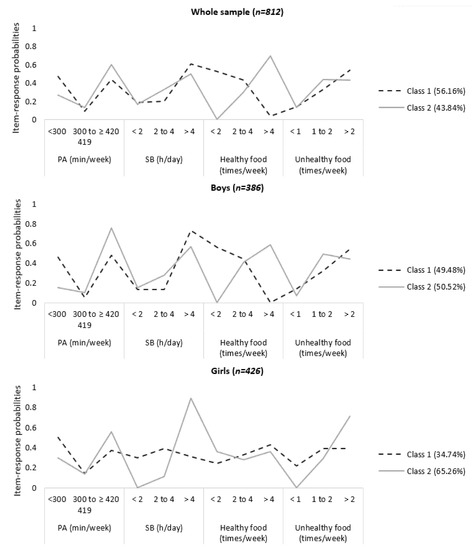 Girls. Class 2 included a higher proportion of girls (65.26%), compared to Class 1. Girls in this class had high probabilities of practicing ≥420 min per week of PA, spending >4 h per day of engaged in SB and consuming SSS >2 times per week. Members of this class also presented low probabilities of consuming F&V >4 times per week. Class 1 comprised 34.74% of girls, which was characterized by higher probabilities of practicing <300 min per week of PA, spending 2 to 4 h per day engaged in SB, consuming >4 per week of F&V and >2 and 1 to 2 times per week of SSS.