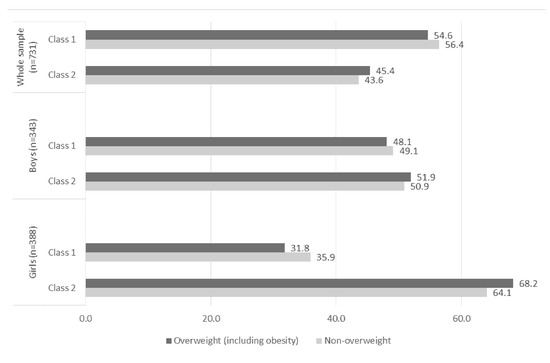 Figure 2 shows the weight status of the students according to classes of behaviors. There were no significant differences between weight status and classes in all stratums (whole sample, boys and girls).