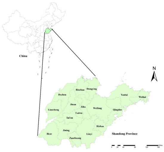 The study was conducted in Shandong Province, which is located on the east coast of China, between latitudes 34°25′ and 38°23′ N and longitudes 114°36′ and 122°43′ E (Figure 1). As of 2017, Laiwu City is not included in Jinan City. This study still divided Shandong Province into 17 cities.