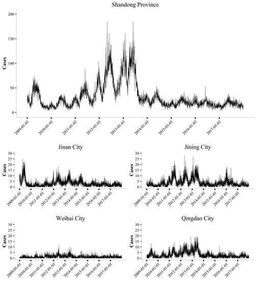 The daily recorded data of mumps cases in 17 cities from 1 January 2009 to 31 December 2017 were collected from the Information System of the Shandong Center for Disease Control and Prevention. The daily meteorological data of 17 cities in Shandong Province were obtained from the China Meteorological Science Data Sharing Service System (http://data.cma.cn/, accessed on 27 September 2021). The socioeconomic factors of each city were all from the Statistical Yearbook of Shandong Provincial Bureau of Statistics (http://tjj.shandong.gov.cn/tjnj, accessed on 27 September 2021).