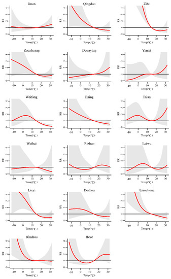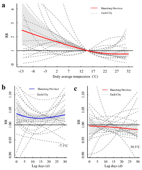 In the first stage, we obtained the exposure–response relationship between the daily average temperature and the cumulative relative risk (RR) of mumps in 17 cities in Shandong Province, with different lag days. The exposure–response relationship when the lag time was 30 days is shown in Figure 3. It can be seen that RR changed with temperature (we take 14.7 °C as the reference temperature), and the exposure–response relationship varied from city to city. Most of the curves were “V”-, “L”-, or “S”-shaped. The cumulative RR was highest when the temperature was −12.6 °C, with an RR of 2.429 (95%CI: 1.339–4.407). As the daily average temperature gradually increased, the cumulative RR of mumps decreased. When the temperature was 29.7 °C, the cumulative RR was reduced to the lowest (RR = 0.759, 95%CI: 0.545–1.056), which was not statistically significant (Figure 4a).