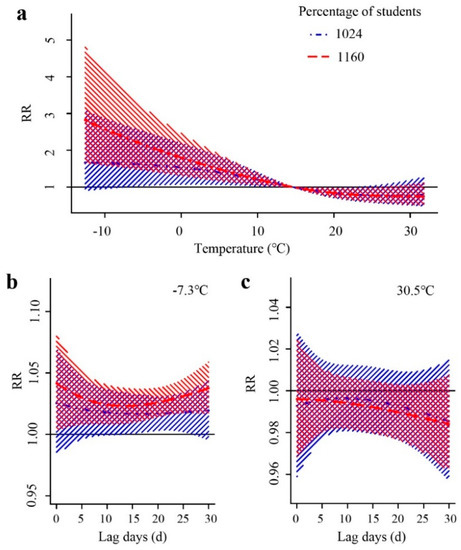 Based on the meta-regression model, we used P25 (1024/10,000) and P75 (1160/10,000) to represent the low and high proportions of primary and secondary school students, respectively. The exposure–response relationship of RR to temperature was different when the proportion of primary and secondary school students was different (Figure 5a). Compared with the median temperature of 14.7 °C, as the temperature increased, areas with a high proportion of primary and middle school students had a higher risk of mumps than areas with a low proportion. Areas with a high proportion of students had a greater risk at low temperatures, reaching a maximum value at −12.6 °C (RR = 2.778, 95%CI: 1.631–4.730), and then gradually decreased. The areas with a low proportion of students also had the highest risk (RR = 1.633, 95%CI: 0.88–3.004) at −12.6 °C, but this was not statistically significant.