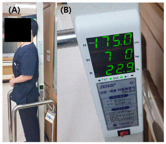 (A) Subjects stand upright in an anatomical position for measuring height. (B) The subject’s living height was measured by using the standard height measurement scale taken in centimeters (cm) (with one decimal place).