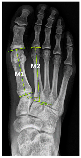 The first and second metatarsal lengths of the subject’s feet were measured with a standing dorso-plantar X-ray using the Picture Archiving and Communication System (PACS, Infinitt M6 version, Infinitt, Seoul, Korea), a digital medical image viewer commonly used in hospitals.