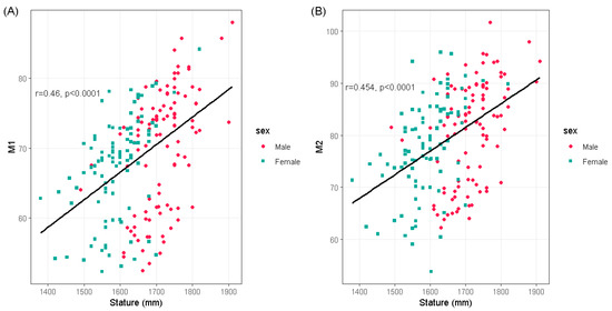 Figure 3 shows the relationships between the stature and lengths of the first and second metatarsal lengths in the men and women, respectively. According to Table 3, Table 4 and Table 5, R was significant in all cases (p < 0.001). The stature was correlated with the size of the metatarsal bone in both genders. However, stronger correlations were detected between the stature and lengths of the metatarsal bone (M1; R = 0.4758, M2; R = 0.4773) in female. The highest correlation with stature was M2 for females (maximum length of 2nd metatarsal). The corresponding regression equation is as follows: S (Stature) = 1294.32 + 3.81M2, R = 0.4773.
