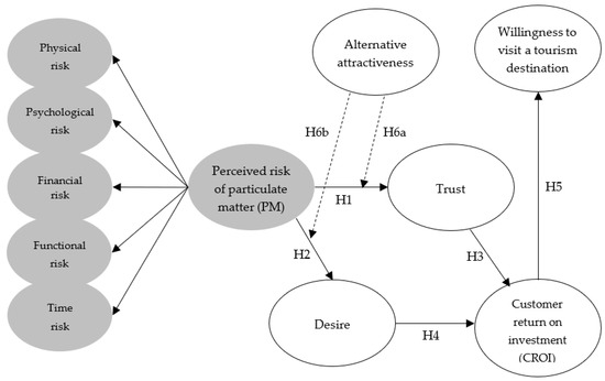 Tourists perceive PM as a potential health risk or a factor limiting travel, and they are very likely to change or cancel travel plans because of it [8,9]. Hence, PM is a negative factor that can reduce the number of tourists and reduce the desire to visit. As such, PM in the tourism industry is a threat that causes many problems, and hence, many studies have studied the issue of PM. However, an examination of existing studies on PM reveals that there are very few that investigate the effect of PM on the tourism industry. Accordingly, the main purpose of this study is to understand the perceived risk factors for PM and the impact of perceived risk of PM on the domestic tourism market. Specifically, the study examines 1) the perceived risk of PM, 2) the effect of the perceived risk of PM on trust in the tourism destination and desire for it, 3) the effect of trust in and desire for tourism destinations on customer return investment, and 4) the impact of customer return investment on the willingness to visit the tourism destination. Finally, this study investigates the moderating effect of alternative attractiveness on the relationship between the perceived risk for PMs and trust in and desire for tourism destinations.