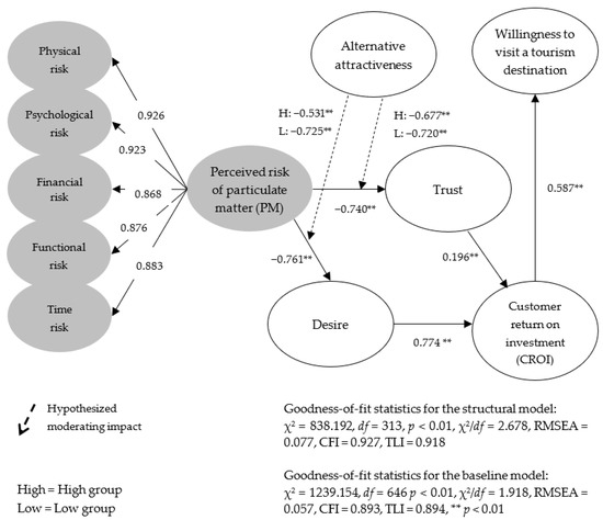 This study performed an invariance test to verify the moderating effect of alternative attractiveness on the relationship between perceived risk for PMs and trust in and desire for tourism destinations. Hypotheses 6a and 6b were verified by classifying the 285 respondents into a high alternative attractiveness group (179 people) and a low alternative attractiveness group (106 people). The analysis showed that alternative attractiveness (Δχ2(1) = 7.004, p < 0.05) has a statistically significant moderating effect on the relationship between perceived risk of PM and trust in the tourism destination. However, alternative attractiveness (Δχ2(1) = 2.723, p > 0.05) was found to have no statistically significant moderating effect on the relationship between perceived risk of PM and desire for the tourism destination. Accordingly, Hypothesis 6a was supported, while Hypothesis 6b was not supported. These results reveal that there is a partially significant difference in each relationship presented in this study based on alternative attractiveness. This can be considered a very meaningful result. In addition, our research results agree with the findings of Jones et al. [34] and Nagengast et al. [45] claiming that consumer behavior can be either positive or negative depending on the alternatives’ attractiveness. Specific detailed results are shown in Table 3 and Figure 2.