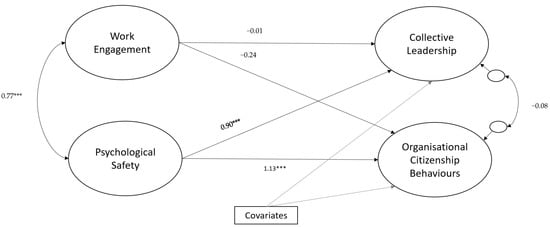 Structural model illustrating the relationship (standardised estimates) between work engagement and psychological safety, and collective leadership and organisational citizenship behaviours. Note: Individual exogenous covariate pathways are omitted for visual clarity. Statistical significance: *** p < 0.001.