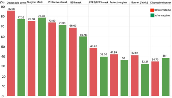 Similarly, a decrease in the amount of PPE was seen after vaccination. While the mean amount of PPE use was 4.69 in unvaccinated dentists, this mean was 4.33 after vaccination. It was seen that these decreases in the average amount of PPE of the participants showed a statistically significant difference. The amount of PPE regressed in dentists with the potential effect of confidence after the vaccination. Since the high transmission risk of COVID-19 and its ability to cause severe respiratory problems is well known, the existence of PPE is substantial to prevent the spreading of infection with regards to dentistry. PPE includes FFPE masks, sterilized gloves, and respirators [16]. PPE most preferred by dentists were disposable gown (85.68%), surgical mask (75.36%), N95 mask (68.63%), and FFP2/FFP3 mask (48.42%) for before vaccination, and it was detected that these percentages were 77.26%, 78.73%, 59.78%, and 39.36%, respectively, in the period after vaccination (Figure 1). In the previous study of these authors, it was detected that the rate of surgical mask use and N95/FFP2/FFP3 mask use were 81% and 47%, respectively [17]. In a study of Italian dentists, it was seen that the rates of surgical mask and FFP2/FFP3 mask use were 74.56% and 54.84%, respectively [18]. In a comprehensive study that was carried out in many countries, it was found out that the percentage of N95 mask use was 46.6% [19].