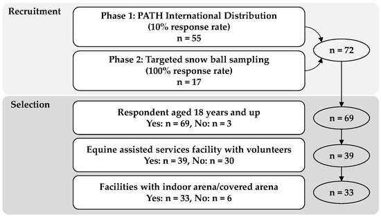 In Phase 1, 55 individual EAS facilities (10% response rate) were recruited. Following targeted recruitment, 17 more facilities responded (100% response rate). A total of 72 responses were realized (96% domestic United States). Sixty-nine facilities were represented with one respondent from each facility above 18 years. We included facilities that offered EAS and used volunteers (n = 39). Facilities without an indoor arena/covered arena were excluded. Within the original 72 responses, three non-domestic facilities, in Brazil, Hong Kong, and Puerto Rico were eliminated for either not having an indoor arena/covered arena, and/or for not using volunteer workers leaving a data set representing only United States responses. A total of 33 responses were used in the data analysis as shown in Figure 1.