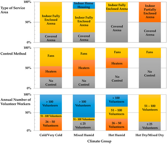 Climate drives equestrian facility design and ventilation type. In the United States, areas with colder and more inclement climates have equestrian arenas that are more enclosed with four solid walls and a roof [15]. In climates with requirements for greater ventilation to maintain comfort, arenas were more likely to be open with removable or no sidewalls. Research by McGill et al. was the first of its kind to characterize indoor arena design by climate, yet this study did not include sufficient EAS programs to address how non-profit facilities may differ or be similar to for-profit equestrian sport. Extreme weather conditions vary by climate and with more open facility designs, workers are subjected to outdoor conditions. Climate-related occupational hazards relevant to FOW in EAS programs include increased ambient temperatures, air pollution, ultraviolet radiation, and changes in the built environment [16].