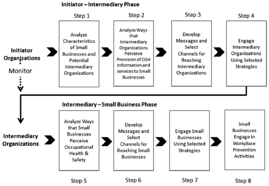 - Sinclair, R.C.; Cunningham, T.R.; Schulte, P.A. A model for occupational safety and health intervention diffusion to small businesses. Am. J. Ind. Med. 2013, 56, 1442–1451. [Google Scholar] [CrossRef]