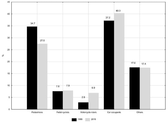 After 20 years, in 2018, the number of deaths decreased to less than half and was 3672 (0.9% of all deaths of Polish residents). Car occupant injuries made up the largest group of causes of death due to transport accidents. In 1999, deaths due to this group of causes among all transport accidents constituted 37.2%, in 2018, the value increased to 40.3% (Figure 1).