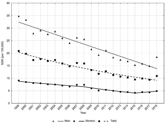 The highest SDR values were noted for women aged 45–64 years (Table 3). Their value decreased from 8.3 in 1999 to 4.8 in 2018. This trend changed in 2015. Between 1999 and 2015, SDRs decreased at a rate of −4.7% (p < 0.05) but between 2015 and 2018, SDRs began to increase at a rate of 5.0% (p > 0.05) (Table 4).