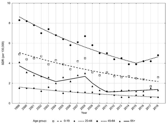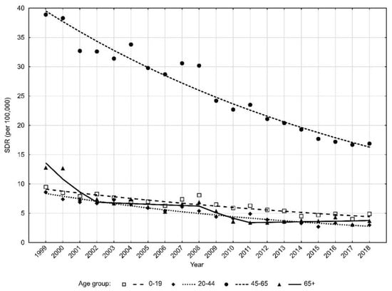 In the group of females aged 0–19 years, SDRs values decreased from 4.9 in 1999 to 2.6 in 2018 (APC = −4.3%, p < 0.05). The lowest SDR values were observed in women aged 20–44 years, and they were the following: 1.5 in the year 1999 and 0.6 in the year 2018 (APC = −5.0%, p < 0.05).