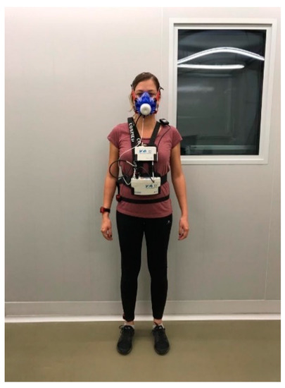 Figure 1 exemplifies the equipment’s disposition, with the portable metabolic analyzer in the anterior part of the body (portable unit, battery, mask), an ambient thermometer in the shoulder, and the actigraphs in the wrist, waist, and ankle. According to the fabricant’s instructions, the heart rate monitor was set under the participant’s clothes in direct contact with the thorax skin.