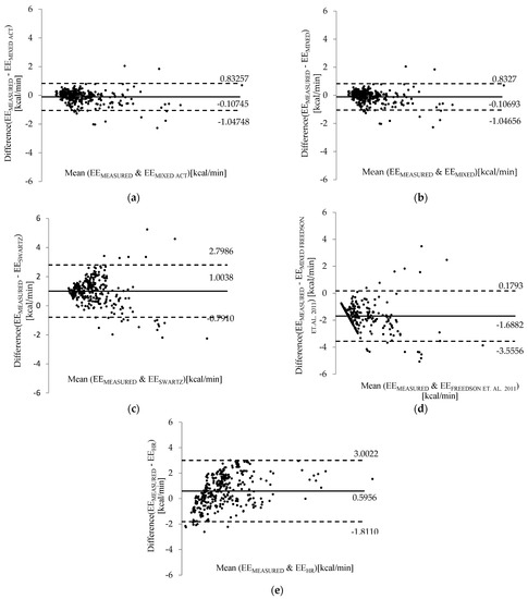 The mixed models (a) and (b) show good agreement with the values of energy expenditure measured by calorimetry because the bias standard error values are closer to zero. Other techniques present a graphically visual distance and the relationship with heart rate (e) method and the (c) Swartz [45] and (d) Freedson VM3 combined [69] equations.