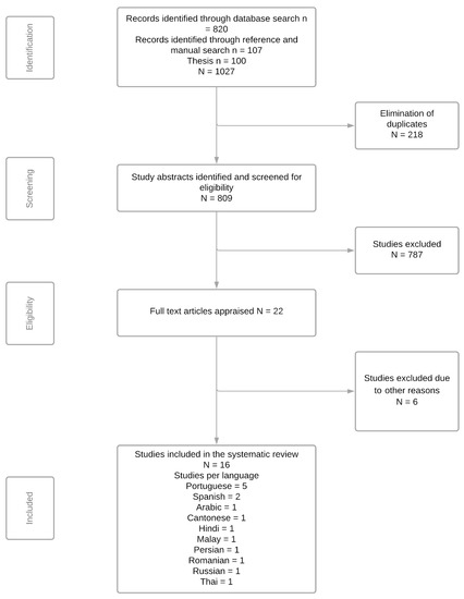Initial searches retrieved a total of 927 articles from the electronic databases and manual search. In addition, theses and dissertations were searched, which further resulted in 100 studies. After the removal of 218 duplicates, 809 articles were identified for further reading. Of these, 786 articles were excluded as they did not measure OHL and report on the translation and cross-cultural adaptation of OHL tools. Further, one study was removed due to language limitations, and one study was removed due to accessibility issues. A total of 22 full-text studies were assessed by two authors (SP and AA), which further excluded six studies based on the eligibility criteria. The reasons for exclusion are provided in Table S3. The Cohen’s kappa value of agreement between the reviewers was 0.90, and any disagreement was resolved through a consensus and discussion process. Finally, this review included a total of 16 studies on the translated version of OHL tools evaluating instruments in 11 different languages. The identification, screening, and eligibility process are outlined in the PRISMA flow diagram (Figure 1).