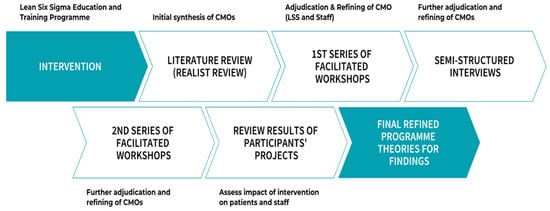 Within realist inquiry, two approaches have come to the fore: realist review and realist evaluation. Realist review, sometimes known as realist synthesis, is a companion research approach to realist evaluation, involving the analysis of existing data including stakeholders’ views and opinions, whilst realist evaluation is a form of inquiry utilised for primary research and involves the collection of data from the source [35,36,37,38,39,40,41,42]. Realist evaluation focuses on interventions and there is a growing body of work using realist inquiry to analyse interventions within healthcare organisations [43,44] including those using LSS methodology [12,45,46]. In this study, the intervention was identified as the university-delivered LSS staff education and training programme. Realist evaluation is a theory-based evaluation designed to test and refine a theory that has informed the development of programmes or interventions. Commensurate with a critical realist approach [47], this study used both realist review to develop programme theory and realist evaluation to collect primary data to test and further refine it. Figure 1 indicates the key research steps during this study.