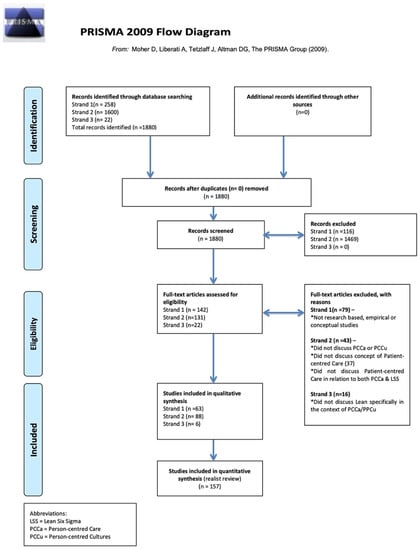 The databases CINAHL, EBSCOhost, Proquest, and Medline were initially used to identify studies that were relevant to the review questions and involved LSS, person-centred care, and person-centred cultures or a combined use of both LSS and person-centred care methodologies in healthcare. The studies encompassed both empirical and conceptual work. Opinion or editorial pieces were excluded. Three strands were identified for the literature search: