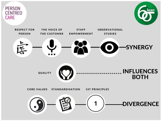 - A second series of facilitated workshops with study participants to arrive at a final adjudication of the CMOc as refined in workshop one and further refined in the individual interviews. Participants worked with the researchers to consider the data from the realist review, from LSS poster presentations and from their own workshop and individual interviews and to use that information to adjudicate the existing CMOc. Finally, participants located the adjudicated CMOc within the synergies and divergences identified between LSS, person-centred care, and person-centred cultures located in a previous review of the literature by the authors of this study [18]. These synergy and divergences are represented in Figure 3.