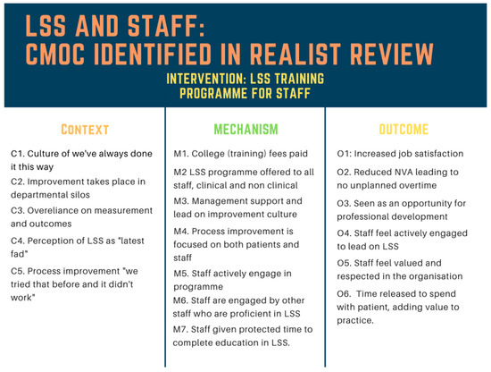 The CMOc relating to staff extracted from the realist review identified five potential contexts or contextual factors, seven mechanisms, and six outcomes (Figure 4). The CMOc identified that staff who were LSS practitioners often operated in contexts (C) where they met expressions of ‘we’ve always done it this way’ (C) [60,61] with improvement happening in silos and not across departments or organisations (C) [3,9,10]. They also encountered perceptions of LSS as ‘the latest fad’ (C) [62,63,64] and feelings of ‘we tried that before and it didn’t work’ amongst colleagues(C) [65]. Another context they encountered was that healthcare staff often expressed that there was an overreliance on measurement and outcomes [18,26,29]. Mechanisms (M) that facilitated engagement with LSS interventions included providing staff supports for education and training in LSS [66,67,68,69] including assistance with fees (M) and protected time to complete education (M). The interdisciplinary nature of LSS enabled staff across all disciplines [70] to access LSS education and training programmes (M), actively self-selecting for them (M), and finding support in their practice areas from other staff already proficient in LSS (M) [71]. The presence of management who supported and led on an improvement culture (M) [66] further encouraged staff participation in LSS interventions [1,72], particularly where improvement was focused on both patients and staff (M). Outcomes (O) identified when staff engaged with LSS interventions included increased job satisfaction [73,74,75], reduction in staff overtime [13,76,77,78], and time released to care [79,80,81]. Staff felt that as LSS practitioners they were valued and respected in their organisations (O) [18,82,83], actively engaged to participate, and lead on improvement (O) [9,84,85,86] and that they further saw LSS qualifications as an opportunity for professional development (O) [13,76,77,78].