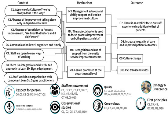 At the study site, LSS practitioners had experienced LSS as an integrative and distributive approach (C) that was well communicated to staff (C) who were open to new ways of working (C). The study site also had a high number of competent LSS practitioners (C). Management within the hospital were visibly active in their support of LSS students and practitioners (M) who used a project charter template to focus their improvement work (M). The promotion of LSS at the departmental level (M) ensured it was understood within specific practice areas and staff were aware of, and used, the support available from the on-site service improvement team (M). In the organisation, staff engagement with LSS led to a focus on staff experience in addition to that of patients (O) and an increase in the quality of patient care and outcomes (O). LSS had also led to a recognised change in the organisational culture (O) and to an ability for staff to transcend their traditional practice area silos (O). In situations where LSS practitioners had in the past encountered a reaction of ‘we’ve always done it this way’ (C) or ‘we’ve tried that before and it didn’t work’ (C) or where improvement took place in silos (C), LSS practitioners indicated how that had adversely influenced their engagement with the LSS education and training programme, and that the anticipated outcomes (O) were not achieved.