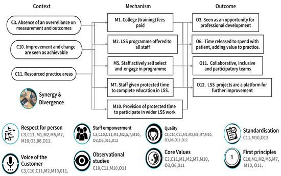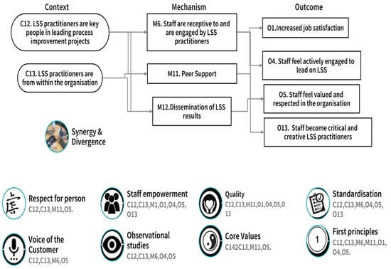 Figure 7 illustrates the contextual factors (Context), Mechanisms, and Outcomes that were confirmed, refuted, or refined through participant adjudication [35]. The previously identified synergy and divergence between LSS and person-centred care [18] are also mapped to the bottom of Figure 7. Finally, each of the noted synergy, divergence, or influence, relating to CMOc3 ‘Participants’ self-perception as LSS practitioners’ are numbered and therefore associated to the relevant Context, Mechanism, and Outcome. This allows us to visualise the alignment of CMOc3 to the synergy/divergence model (Figure 3) and reflects where study participants, through CMOc adjudication, aligned individual contexts, mechanisms, and outcomes to the identified synergy, divergence, or influencer.