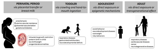 Protection and prevention of health against disease caused by environmental contaminants are the ultimate goals in the fields of human risk assessment and risk management. Usually, these areas of intervention are focused on exposures in adulthood, with the development and implementation of more innovative methodologies for estimating risks [1]; on the contrary, little attention is given to embryonic and fetal periods and childhood, although many diseases later in life caused by toxic agents find their onset in these time windows. In this regard, it is not correct to consider children or adolescents as little adults, but rather as a sensitive target population where biological systems are developing and redefining [2]. In particular, the metabolic processes of absorption and the elimination of environmental contaminants in children are slower than in adults, making them more susceptible to disease outcomes following even small doses [3]. In addition, children’s daily activities of crawling increases hand-to-mouth ingestion, making them vulnerable to greater contact with certain chemicals.