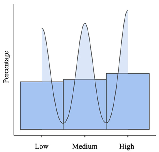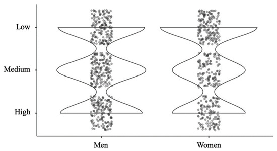 Besides, the violin box plot represents different densities in low, medium, and high state anxiety. Boys indicate higher percentages in low (31.8%; n = 163) and medium anxiety (34.6%; n = 177). However, the percentage of girls is higher in high anxiety (39.9%; n = 175) (Figure 2).