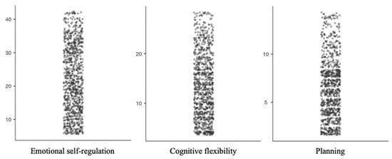 Additionally, to analyze the effects of the COVID-19 lockdown on executive functioning dimensions in children and adolescents (emotional self-regulation, cognitive flexibility, and planning/organization) in a period of the non-attendance educational modality due to the lockdown caused by COVID-19, we conducted a descriptive analysis. According to the means of all three domains, children and adolescents seemed to present a good executive functioning (ESR = 21.86 ± 10.007; CF = 13.49 ± 6.553; PO = 6.49 ± 3.165). However, as the box plot showed (Figure 3), the density of the sample was distributed beyond the mean. While all three EF dimensions presented a tendency toward low scores, the emotional self-regulation domain scores might be almost homogeneous. Similarly, in the cognitive flexibility domain, the children and adolescents scores could be tendentiously homogeneous. Additionally, in the planning and organization domain, the scores were clearly above the mean, considering that the maximum score was 14.