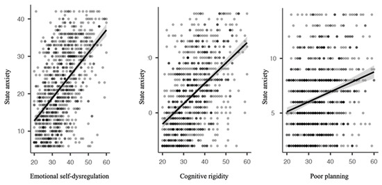 Regarding the examination of the relationship among executive functioning dimensions and state anxiety in children and adolescents, Pearson’s correlations were calculated. The individuals show a positive, strong, and significant correlation with emotional self-dysregulation (0.529), a positive, moderate, and significant correlation with cognitive rigidity (0.429), and a positive, weak, but significant correlation with non-planning/organization (0.250) (Figure 4).