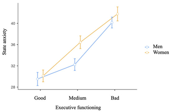 Means of state anxiety between the sexes of the participants in each level of executive functioning.