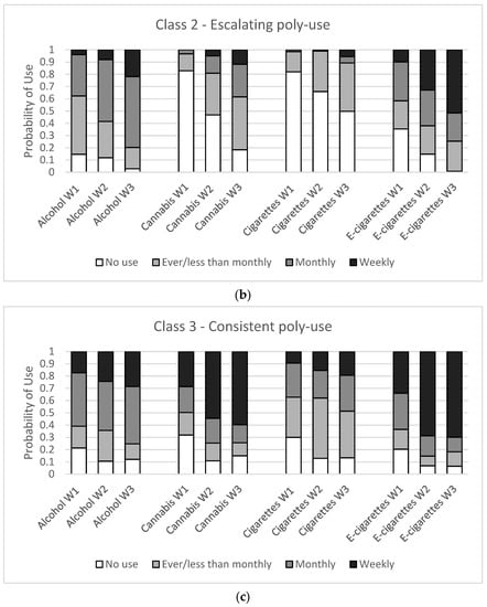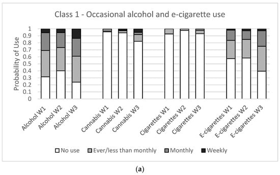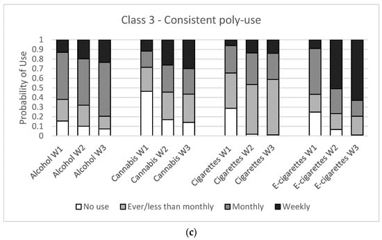 Substance use item probabilities for a four-class latent class model for males in three waves of the COMPASS study (Wave 1: 2017/18, Wave 2: 2018/19, Wave 3: 2019/20) in British Columbia, Alberta, Ontario, and Quebec, Canada. (a) Class 1—experimental alcohol and e-cigarette use, (b) Class 2—escalating poly-use (c) Class 3—consistent poly-use.