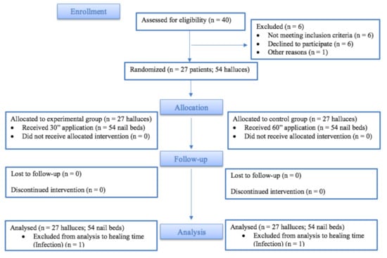 A double-blind clinical trial was carried out according to the Consolidated Standards of Reporting Trials (CONSORT) guidelines [16]. The participants were recruited from Podiatric Clinical Area of the University of Seville (Spain) during 2019. Participating patients gave written consent and follow up was for 12 months. 40 patients were recruited and a total of 27 patients were enrolled with a medial and lateral onychocryptosis in both hallux, and all of them received previously conservative treatment, i.e., removal of the partial ingrown nail plate, without resolution of the pathological condition.