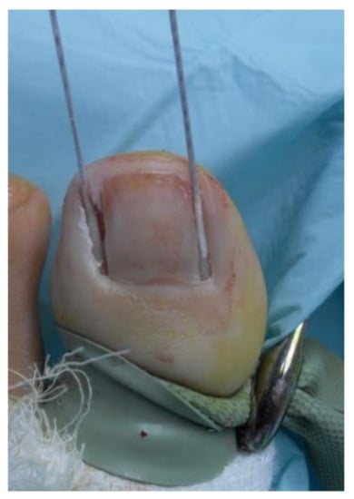 - Zhang, N.; Huang, Z.; Cao, S.H.; Wang, Y.; Hu, Y. Cosmetic, minimally invasive, partial matricectomy of ingrown toenails with granulation tissue. J. Plast. Reconstruc. Aesth. Surg. 2018, 71, 774–775. [Google Scholar] [CrossRef] [PubMed]