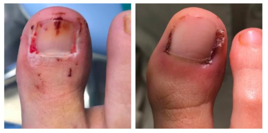 Using 2% mepivacaine, a digital block of each hallux was performed; preoperative surgical antisepsis was performed at both feet, and for local hemostasis a digital tourniquet was applied. Using a free elevator, the medial and lateral nail plate was separated from the nail bed and the eponychium and were removed.