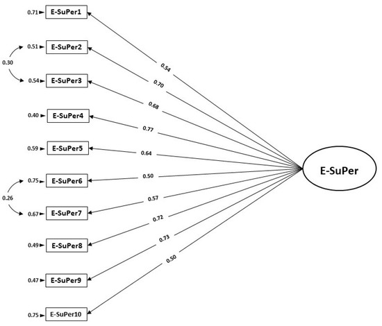 As no further significant modification indices were detected, we accepted model M2 as a reasonable approximation of the underlying factor structure (see Table 2). Figure 2 represents the parameter estimates for model M2 of the E-SuPer instrument. The standardized factor loadings of the ten items ranged from 0.50 to 0.77 (p < 0.05).