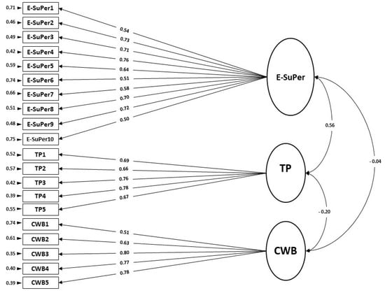 Using CFA for validation purposes, we tested a three-factor model for E-SuPer with Task Performance (TP) and Counterproductive Work Behavior (CWB). A three-factor model where the items of SuPer-TP-CWB load on their respective factors was analyzed (see Figure 3). The fit indices values were found to be χ2 = 254.47, df = 167, p < 0.001; χ2/df = 1.52; RMSEA = 0.06 (90% CI = 0.04–0.07); NNFI = 0.92; CFI = 0.93; AGFI = 0.83. This model showed good fit indices values in each indicator, and modification indices were not necessary to apply in this model.