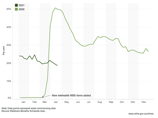 Figure 1. MBS mental health telehealth services (proportion of all MBS mental health services), January 2020–April 2021. (Website: https://www.aihw.gov.au/reports/mental-health-services/mental-health-services-in-australia/report-contents/covid-19-impact-on-mental-health, accessed on 5 October 2021).