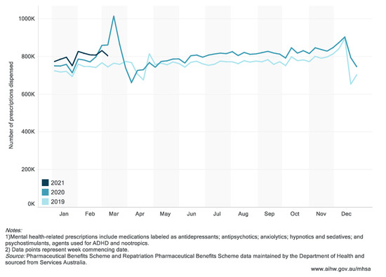Figure 2. PBS mental health-related prescriptions dispensed (by week), January 2019–March 2021. (Website: https://www.aihw.gov.au/reports/mental-health-services/mental-health-services-in-australia/report-contents/covid-19-impact-on-mental-health, accessed on 5 October 2021).