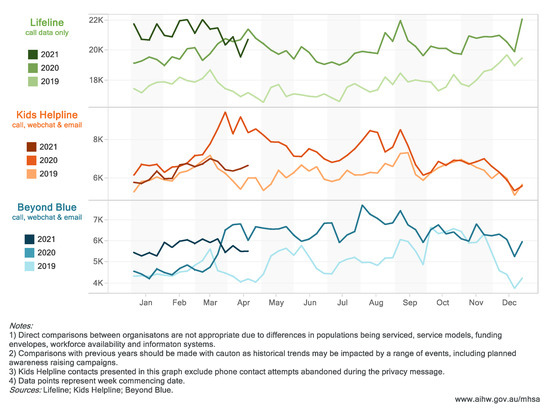 Crisis and support organization contacts (by week), January 2019–April 2021. (Website: https://www.aihw.gov.au/reports/mental-health-services/mental-health-services-in-australia/report-contents/covid-19-impact-on-mental-health, accessed on 5 October 2021).